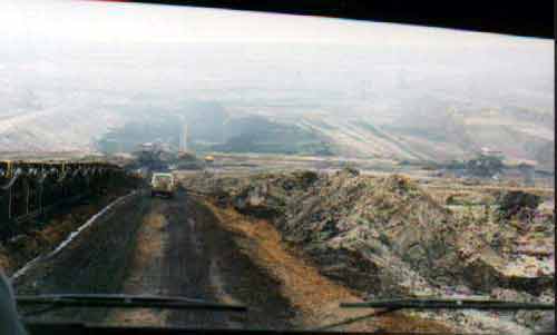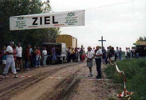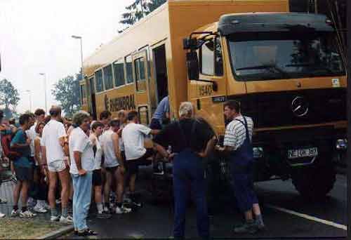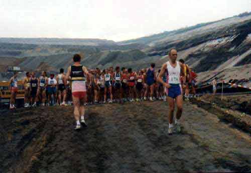 Bei der Einfahrt in die Grube brachte der einsetzende Regen die Busfahrer auf den teils schlammigen Wegen in arge Verlegenheit, so daß die 180 Läufer die letzten 300 Meter zum Startplatz tief in der Grube laufen mußten. Dort gab Dr. Müllensiefen, der stellvertretende Leiter des Rheinbraun-Tagebaus Hambach, den Startschuß.