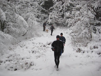 Der Neuschnee der frühen Morgenstunden machte zudem die PKW-Begleitung mit dem Materialtransport ungewiss, sodaß zunächst auf Eigenversorgung geplant wurde. Gepäck, unberührte, verschneite Wege und teilweise tiefe Schneeverwehungen machten den Lauf besonders zeit- und kraftraubend. Daß dennoch eine Verpflegung vom Auto aus gelang, sorgte für den Genuss von warmem Tee und Gebäck bei den der Witterung entsprechend kurzen Aufenthalten an den Treffpunkten. Das war natürlich eine harte Konkurrenz für die vom Dürener Sportshop Vilvo bereitgestellten Carboo4U-Energie-Riegel, die die Kohlenhydratversorgung sicherten.