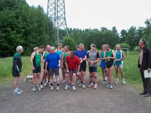 Der Lauf selbst lief eigentlich nur an der Spitze sehr spannend. Da blieben Jürgen Büchel und Holger Lengersdorf bis kurz vorm Ziel zusammen mit weitem Vorsprung vor Heinz-Georg Klein und Javier Gil-Ricart. Ansonsten wurde recht einvernehmlich gelaufen. Bei Ulla Vilvo und Klara Reisen wurde im Ziel die gleiche Zeit notiert, die später bei der Auswertung einiges Kopfzerbrechen bereitete. Wer ist den nun 15. und wer 16. des Gesamteinlaufs? Dies wurde dann so gelöst das beide der gleiche Platz zugewiesen wurde und der 16. Platz frei blieb. Nachdem alle Teilnehmer ins Ziel gekommen waren zogen wir schnell ins Vereinsheim mit einem kleinen Umweg über die Duschen. Auf uns wartete ein schöner Imbiß das von Konrad Vilvo und weiteren Küchenhelfern (Kuchenspende von Monika!) organisiert wurde. Neben dieser Stärkung wurde von Javier die Auswertung durchgeführt und die Urkunden ausgefüllt, nicht ohne den peinlichen Fehler zu begehen, zu übersehen, das Andrea nicht in der M35 ist! Hans Hohn, gut verbunden, verlieh diese Urkunden dann an die Teilnehmer und viele hatten in ihrer Altersklasse gewonnen, so hörte man häufig: "Erster in der AK soundso wurde:"